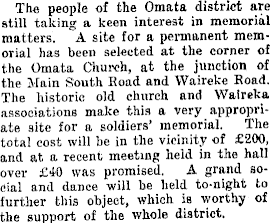 The people of the Omata district are still taking a keen interest in memorial matters. A site for a permanent memorial has been selected at the corner of the Omata Church, at the junction of the Main South Road and Waireke Road. The historic old church and Waireka associations make this a very appropriate site for a soldiers’ memorial. The, total cost will be in the vicinity of £2OO, and at a recent meeting held in the hall over £4O was promised. A grand social and dance will be held to-night to further this object, which is worthy of the support of the whole district.