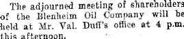The adjourned meeting of shareholders of the Blenheim Oil Company will be held at Mr. Vai. Duff's office at 4. p.m. this afternoon.