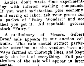 Ladies, don’t waste time experimenting with inferior washing compounds. If you want satisfaction plus economy, and saving of labor, ask your grocer for a packet of “Fairy Wonder,” and see that you get it. All reputable grocers stock “Fairy.” A preliminary of Messrs. Gilbert Bro©.’ sale appears in our auction columns. This sale should attract particular attention, as the vendors have always farmed on thorough lines, and kept only the best of everything. Full particulars of the sale will appear in. later icuiMAa.