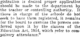 gistration is desired proper application should be made to the department by the teacher or controlling authority. If (hose in charge of the schools do not seek to have thorn registered, it remains for the board to exercise the powers conferred upon it by the clauses of the Education Act, 1914, which refer to compulsory attendance.”