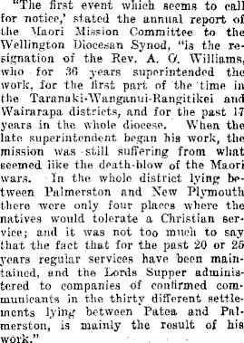 “The first event which seems to call for notice,’ slated the annual report of the Maori Mission Committee to the Wellington Diocesan Synod, “is the resignation of the Rev. A. Cji. Williams, who for 36 years superintended the work, for the first part of the time in the Taranaki-Wanganui-Rangitikei and Wairarapa districts, and for the past 17 years in the whole diocese. When, the late superintendent began his work, the mission was still suffering from what seemed like the death-blow of the Maori wars. In the whole district lying between Palmerston and New Plymouth there were only four places where the natives would tolerate a Christian service; and it was not too much to say that the fact that for the past 20 or 25 years regular services have been maintained, and the Lords Supper administered to companies of confirmed communicants in the thirty different settlements lying between Patea. and Palmerston, is mainly the result of his work.”