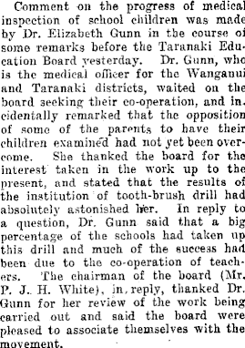 Comment on the progress of medical inspection of school children was made by Dr. Elizabeth Gunn in the course of some remarks before the Taranaki Education Board yesterday. Dr. Gunn, who is the medical officer for the Wanganui and Taranaki districts, waited on the board seeking their co-operation, and in. cidentally remarked that the opposition of some of the parents to have their children examined had not yet been overcome. She thanked the board for the interest taken in the work up to the present, and stated that the results of the institution of tooth-brush drill had absolutely astonished her. In reply to a question, Dr. Gunn said that a big percentage of the schools had taken up this drill and much of the success hart been due to the co-operation of teachers. Tiie chairman of the board (Mr. P. J.. H. White), in, reply, thanked Dr. Gunn for her review of the work being carried out and said the board were pleased to associate themselves with the movement.