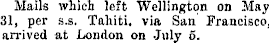 Mails which left Wellington on May 31, per s.s. Tahiti, via San Francisco, arrived at London on July 5.