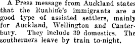 A Press message from Auckland states that the Ruahine’s immigrants are a good type of assisted settlers, mainly for Auckland, Wellington and Canterbury. They include 39 domestics. The southerners leave by train to-night.