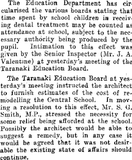 The Education Department has circularised the various boards stating that time spent by school children in receiving dental treatment may be counted as attendance at school, subject to tile necessary authority being produced by the pupil. Intimation to this effect was given by the Senior Inspector (Mr. J. A. Valentine) at yesterday’s meeting of the Taranaki Education Board. The Taranaki Education Board at yesterday’s meeting instructed the architect to furnish estimates of the cost of remodelling the Central School. In moving a resolution to this effect, Mr. S. G. Smith, M.P., stressed the necessity for some relief being afforded at the school. Possibly the architect would be able to suggest a remedy, but in any case it would be agreed that it was not desirable the existing state of affairs should continue.