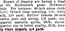 Buyers of drapery are having a feast at the Melbourne’s great Midwinter Sale. For instance: 40-inch nurse cloth, 1/11; 16-dnch linen towelling, 1/3; white silk, 3/9 yard; Hollins’ famous 36-inch calico, pure and strong, 1/6 yard; tenquarter mareella quilts, 19/6; elevenquarter size in better quality, 27/6; lovely, white damwek, 4/6 yapA