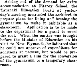 Arising out of the demand for extra accommodation at Fitzroy School, the Taranaki Education Board at yesterday's meeting instructed the architect to prepare plans for lining and heating the gymnasium to make it habitable as a class-room. Application is to be made to the department for a grant to cover the cost. When the matter was brought before the Minister of Education on his visit to New Plymouth, he indicated that he could not approve of expenditure for additions at present, but would be prepared to grant a sum for the conversion of the gymnasium to a temporary classroom.