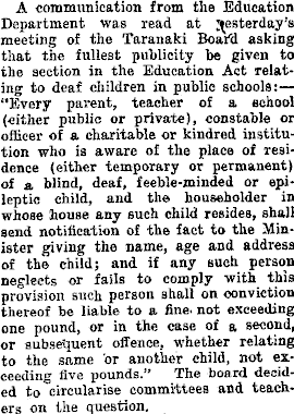 A communication from the Education Department was read at yesterday’s meeting of the Taranaki Boat'd asking that the fullest publicity be given to the section in the Education Act relating to deaf children in public schools:— ‘’Every parent, teacher of a school (either public or private), constable or officer of a charitable or kindred institution who is aware of the place of residence (either temporary or permanent) of a blind, deaf, feeble-minded or epileptic child, and the householder in whose house any such child resides, shall send, notification of the fact to the Minister giving the name, age and address of the child; and if any such person neglects or fails to comply with this provision such person shall on conviction thereof be liable to a fine, not exceeding one pound, or in the case of a second, or subsequent offence, whether relating to the same or another child, not exceeding five pounds.” The board decided to circularise committees and teachers on the question.