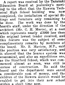A report was received by the Taranaki Education Board at yesterday’s meeting to the effect that the Hawera Technical High School building way now completed, the installation of special fittings and furniture only remaining to be done. The work was done by the board’s staff, under the direction of The architect (Mr. C. H. Moore), at a cost which represents nearly £3OOO less than the original lowest tender received, and this feature was the subject of some complimentary remarks by members of the board. Mr. R. Masters, M.P., said the position was very satisfactory, and it showed that the boaras system was economical, and also an expeditious one, as the Stratford School, which was commenced almoat as soon, was still in coruse of construction. He said the board and the department were saved a considerable sum of money, and the children of the Hawera district would be enabled to get into their new school within a short time now.