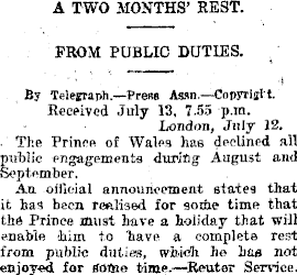 A TWO MONTHS’ REST. FROM PUBLIC DUTIES. By Telegraph.—Press Assn.—Copyright. Received July 13, 7.55 p.m. London, July 12. The Prince of Wales has declined all public engagements during August and September. An official announcement states that it has been realised for some time that th? Prince must have a holiday that will enable him to have a complete rest from public duties, which he has not enjoyed for Softie time.—Reuter Service.