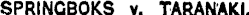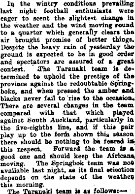 In the wintry conditions prevailing last night football enthusiasts were eager to scent the slightest change in the weather and the wind moving round to a quarter which generally clears the air brought promise of better things. Despite the heavy rain of yesterday the ground is expected to be in good order and spectators are assured of a great contest. The Taranaki team is determined to uphold the prestige of the province against the redoubtable Springboks, and when pressed the amber and blacks never fail to rise to the occasion. There are several changes in the team compared with that which played against South Auckland, particularly in the five-eighths line, and if this pair play up to the forffi shown this season there should be nothing to be feared in this respect. Forward the team a good one and should keep the moving. The Springbok team was not available last night, as its final selection depends on the state of the weathec this morning. The Taranaki team is as follows: