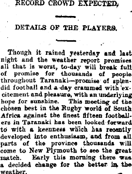 BECORD CROWD EXPECTED. DETAILS OF THE PLAYERS. Though it rained yesterday and last night and the weather report promises all that is worst, to-day will break full of promise for thousands of people throughout Taranaki—promise of splendid football and a day crammed with excitement and pleasure, with an underlying hope for sunshine. This meeting of the chbsen best in the Rugby world of South Africa against the finest fifteen footballers in Taranaki has been looked forward to with a keenness which has recently developed into enthusiasm, and from all parts of the province thousands will come to New Plymouth to see the great match. Early this morning there -was a decided change for the better in. the weather.