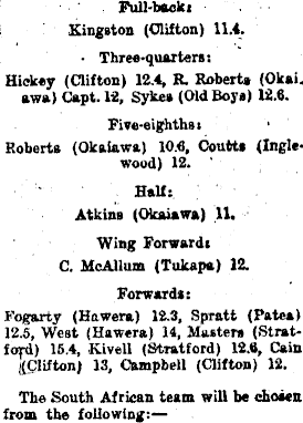 Full-back: Kingston (Clifton) 11.4. Three-quarters: Hickey (Clifton) 12.4, R. Roberts (Okai. awa) Capt. 12, Sykes (Old Boys) 12.6. Five-eighths: Roberts (Okaiawa) 10.6, Coutts (Inglewood) 12. Half: Atkins (Okaiawa) 11. Wing Forward: C. McAllum (Tukapa) 12. Forwards: Fogarty (Hawera) 12.3, Spratt (Patea) 12.5, West (Hawera) 14, Masters (Stratford) 15.4, Kivell (Stratford) 12.6, Cain (Clifton) 13, Campbell (Clifton) 12. The South African team will be chosen from the following:—