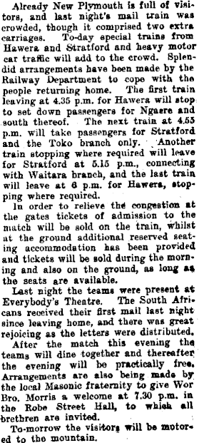 Already New Plymouth is full of visitors, and last night’s mail train was crowded, though it comprised two extra carriages. To-day special trains from Hawera and Stratford and heavy motor car traffic will add to the crowd. Splendid arrangements have been made by the Railway Department to cope with the people returning home. The first train leaving at 4.35 p.m. for Hawera will stop to set down passengers for Ngaere and south thereof. The next train at 4.55 p.m. will take passengers for Stratford and the Toko branch only. Another train stopping where required will leave for Stratford at 5.15 p.m., connecting with Waitara branch, and the last train will leave at 6 p.m. for Hawera, stopping where required. I In order to relieve the congestion at 1 the gates tickets of admission to the match will be sold on the train, whilst at the ground additional reserved seating accommodation has been provided and tickets will be sold during the morning and also on the ground, as long aa the seats are available. Last night the teams were present at Everybody’s Theatre. The South Africans received their first mail last night since leaving home, and there was great rejoicing as the letters were distributed. After the match this evening the teams will dine together and thereafter the evening will be practically free. Arrangements are also being made by the local Masonic fraternity to give Wor Bro. Morris a welcome at 7.30 p.m. in the Robe Street Hall, to which ell brethren are invited. To-morrow the visitors will be motored to the mountain.