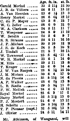Gerald Morkel .... Age. it. in. . 33 5 Hi st. lb. 12 10 J. B. de Villiers .. . 28 5 11 13 12 A. Van Ileerden .. . 23 <1 li 13 3 Henry Morkel .... . 26 6 OJ 12 12 C. du P. Meyer .. . 23 5 « 12 7 W. C. Zeller ....... . 26 C 0 12 0 W. A. Clarkson 24 5 11 11 7 *T. Weepener .«]■>••• . 24 5 9 11 12 W Sendin . 21 5 6 9 7 S. S. Strauss ..... . 28 5 11 12 10 J P Michau . 20 5 10 12 2 J. S. de Koch ..... . 24 5 5 10 2 J Tindall . 21 5 7 10 11 W. Townsend • • • • ■ . 25 5 44 11 4 W. H Morkel ..« . 35 6 1 14 0 M. Kilis • • . 29 5 11 13 8 T. Kruger . ..•••■• . 25 5 0 14 4 J. W. Van Rooyen . 28 6 1} 15 10 J. M. Michau ..... . 30 6 4 17 0 N. du Plessis . 35 5 Hi 14 4 A. P. Walker ...... . 28 6 Di 13 8 L. B. Siedie .. . 29 5 94 11 0 F. W. Mellish ...» < 24 6 0 13 12 Royal Morkel . 25 6 3 17 2 . 32 5 11J 13 0 p .1 Mostert .... . U 8 0 13 12 H. Scholtz • . 29 5 10J 13 3 T. P. Pienaar (cap* ) 32 5 104 13 3 J. Olivier . 24 5 11 14 11 Mr. Atkinson, f Wanganui, will
