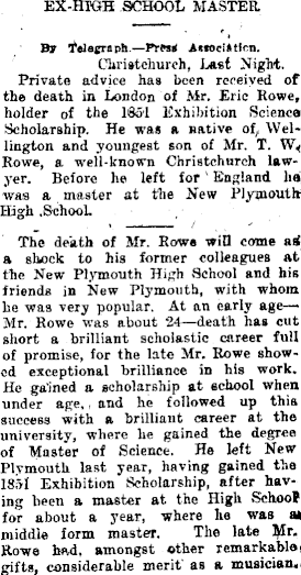 EX-HIGH SCHOOL MASTER By Telegraph.—Press AwociAticn. Christchurch, Last Night. Private advice has been received of the death in London of Mr. Eric Rowe, holder of the 1851 Exhibition Science Scholarship. He was a native of, Wellington and youngest son of Mr. T. Ww Rowe, a well-known Christchurch lawyer. Before he left for England ha was a master at the New Plymouth High .School. The death of Mr. Rowe will come as a shock to his former colleagues at the New Plymouth High School and his friends in New Plymouth, with whom he was very popular. At an early age— Mr. Rowe was about 24—death has cut short a brilliant scholastic career full of promise, for the late Mr. Rowe showed exceptional brilliance in his work. He gained a scholarship at school when under age. and he followed up this success with a brilliant career at the university, where he gained the degree of Master of Science. He left New Plymouth last year, having gained the 1851 Exhibition Scholarship, after having been a master at the High School* for about a year, where he was ua middle form master. The late Rowe had. amongst other remarkable gifts, considerable merit as a musician.