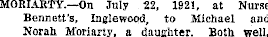 MORIARTY.—On July 22, 1921, at Nurse Bennett’s, Inglewood, to Michael and Norah Moriarty, a daughter. Both well.