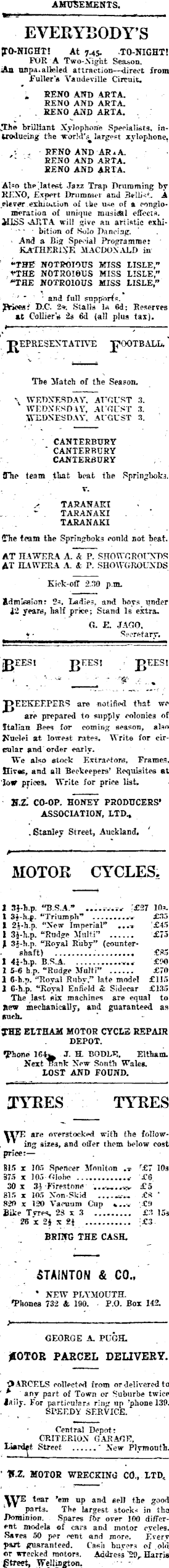 AMUSEMENTS. EVERYBODY’S TO-NIGHT! At 7.45. TO-NIGHT! FOR A Two-Night Season. An unparalleled attraction—direct from Fuller’s Vaudeville Circuit. RENO AND ARTA. RENO AND ARTA. RENO AND ARTA. ..The brilliant Xylophone Specialists, introducing the -world’s largest xylophone, RENO AND AR aA. RENO AND ARTA. RENO AND ARIA. Also the.latest Jazz Trap Drumming by RENO, Expert Drumm and Bellis*. A clever exhibition of the use of a conglomeration of unique musidkl effects. MISS -ARTA will give an artistic exhibition of Solo Dancing. And a Big Special Programme: KATHERINE MACDON ALD in “THE NOTROIOUS MISS LISLE,” 'THE NOTROIOUS MISS LISLE,” “THE NOTROIOUS MISS LISLE,” and full supports. I¥iees: D.C. 2s. Stalls l«s 6d: Reserves at Collier’ii 2s 6d (all plus tax). JDEPRESENTATIVE JfOOTBALL. The Match of the Season. WEDNESDAY. AUGUST 3. WEDNESDAY, AUGUST 3. WEDNESDAY. AUGUST 3. CANTERBURY CANTERBURY CANTERBURY The team that boat- the Springboks. v. TARANAKI TARANAKI TARANAKI The foam the Springboks could not beat. AT HAWERA A. A P. SHOWGROUNDS AT HAWERA A. A P. SHOWGROUNDS Kick-off 2.30 p.m. Admission: 2~. Ladies, and boys under 12 yeans, half price: Stand Is extra. G. E. JAGO, I - Secretary. jgEES! JgEES! jgEES! TgEEKEEPERS are notified that we are prepared tn supply colonies of Italian Bees for coming season, also Nuclei at lowest rates. Write for circular and order early. We also stock Extractors, Frames. Hives, and all Beekeepers’ Requisites at low prices. Write for price list. N.Z. CO-OP. HONEY PRODUCERS’ ASSOCIATION, LTD., . Stanley Street, Auckland, MOTOR CYCLES, 1 3|-h.p. ‘••B.S.A.” £27 10s. I 3|-h.p. “Triumph” £35 1 21-h.p. “New Imperial” ...« £45 1 3|-h.p. “Rudge Multi’’ £75 1 34-h.p. “Koval Ruby” (countershaft) £B5 1 4i-h.p. B.S.A £9O 1 5-6 h p. “Rudge Multi” £7O 1 6-h.p. •‘Royal Ruby,” late model £ll5 1 C-h.p. “Royal Enfield & Sidecar £135 The last six machines are equal to new mechanically, and guaranteed, as such. THE ELTHAM MOTOR CYCLE REPAIR DEPOT. •Phone J. H. BODLE, Eltham. Next Bank Now South Wales. LOST AND FOUND. TYRES TYRES VITE are overstocked with the follow- . ’’ ing sizes, and offer them below coat price:— 815 x 105 Spencer Moulton .; '£7 10s 375 x 105 Globe £6. 30 x 31 -Firestone £5 SIS x 105 Non-Skid .......... £8 820 x 120 Vacuum Cup %... £9 Bike Tvres, 28 x 3 £3 15s 2ft x 2| x £3 BRING THE CASH. STAINTON & CO., ' NEW PLYMOUTH. •Phones 732 & 190. P.O. Box 142. GEORGE A. PUGH. ACTOR PARCEL DELIVERY. ■JtARCELS collected from or delivered to *■ any part of Town or Suburbs twice Aflily. For particulars ring up ’phone 139. SPEEDY SERVICE. Central Depot: CRITERION GARAGE, Street New Plymouth. tf.Z. MOTOR WRECKING CO., LTD. tear ’em up and sell the good parts. The largest stock* in the Dominion. Spares fbr over 100 different models of cars and motor cycles. Saves 50 per cent and more. Every part guaranteed. Cash buyers of old or wrecked motors. Address *29, Harris (Street, Wellington.