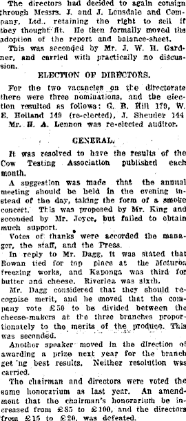 The directors had decided to again consign through Messrs. J. and J. Lonsdale and Company. Ltd., retaining the right to Sell if they thought- fit. He then formally moved the adoption of the report and balance-sheet. This was seconded by Mr. .7. W. H. Gardner, and carried with practically no discussion. ELECTION OF DIRECTORS. For the two vacancies on the directorate there were three nominations, and the election resulted as follows: G. R. Kill 179, W. E. Holland 149 (re-elected), J. Sheurter 144 Mr. H. A. Lennon was re-elected auditor. GENERAL. It was resolved to have the results of the Cow Testing Association published each month. A suggestion was made that the annual meeting should be held in the evening instead of the day, taking the form of a smoke concert. This was proposed by Mr. King and seconded by Mr. Joyce, but failed to obtain much support. e Votes of thanks were accorded the manager, the staff, and the Press. In reply to Mr. Dagg, It was stated that Rowan tied for top place at the Moturoa freezing works, and Kaponga was third for butter and cheese. Riverlea was sixth. Mr. Dagg considered that they should recognise merit., and he unoved that the company vote £5O to be divided between the cheese-makers at the three branches proportionately to the merits of the produce. This was seconded. Another speaker moved in the direction of awarding a prize next year for the branch get ’ng best results. Neither resolution was carried. The chairman and directors were voted the same honorarium as last year. An amendment that the chairman’s honorariurti be increased from £B5 to £lOO, and the directors from £l5 to £2O, was defeated.