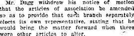 Mr. Dagg withdrew his notice of motion that the articles of association be amended so as to provide that each branch separately elects its own representative, stating that he would bring the matter forward when there were other articles to alter.