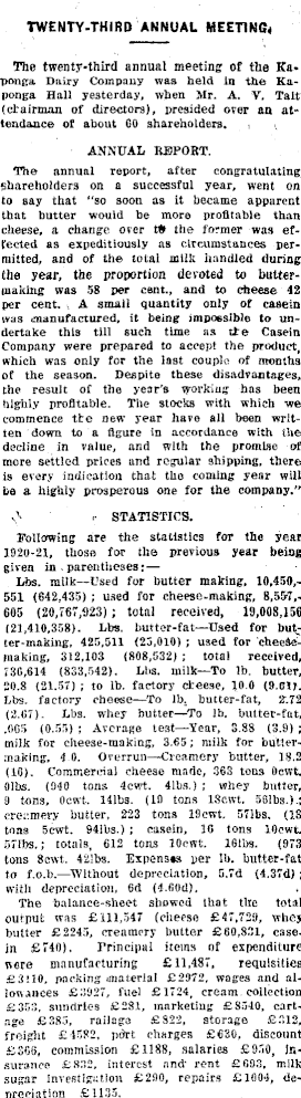 TWENTY-THIRD ANNUAL MEETING* The twenty-third annual meeting of the Kaponga Dairy Company was held in the Kaponga Hall yesterday, when Mr. A. V. Tait (chairman of directors), presided over an attendance of about GO shareholders. ANNUAL REPORT. The annual report, after congratulating shareholders on a successful year, went on to say that “so soon as it became apparent that butter would be more profitable than cheese, a change over tt» the former was effected as expeditiously as circumstances permitted, and of the total milk handled during the year, the proportion devoted to buttermaking was 58 per cent., and to cheese 42 per cent. A small quantity only of casein was .manufactured, it being impossible to undertake this till such time as tie Casein Company were prepared to accept the product, which was only for the last couple of months of the season. Despite these disadvantages, the result of the year’s working has been highly profitable. The stocks with which we commence tte new year have all been written down to a figure in accordance with the decline in value, and with the promise of more settled prices and regular shipping, there is every indication that the coming year will be a highly prosperous one for the company.” STATISTICS. Following are the statistics for the year 1920-21, those for the previous year being given in . parentheses:— Lbs. milk—Used for butter making, 10,450,551 (642,435) ; used for cheese-making, 8,557,605 (20,767,923); total received, 19,008,156 (21,410,358). Lbs. butter-fat—Used for but-ter-making, 425,511 (25,010) ; used for cheesemaking, 312,103 (808,532); total received, 730,614 (833,542). Lbs. milk—To lb. butter, 20.8 (21.57) ; to lb. factory cheese, 10.0 (9.C1). Lbs. factor}- cheese—To lb. butter-fat, 2172 (2.67). Lbs. whey butter—To lb. butter-fat, .065 (0.55) ; Average test—Year, 3.88 (3.9) ; milk for cheese-making, 3.65; milk for buttermaking, 40. Overrun—Creamery butter, 18.2 (LG). Commercial cheese made, 363 tons Ocwt. Olbs. (940 tons 4cwt. 41bs.) ; whey butter, 9 tons, Ocwt. 141bs. (19 tons IScwt. 561b5.).; creamery butter, 223 tons 19cwt. 571bs. (13 tons scwt. 941b5.) ; casein, 16 tons lOcwt. 571b5.; totals, 612 tons lOcwt. 161bs. (973 tons Bcwt. 42'bs. Expenses per lb. butter-fat to f.o.b.—Without depreciation, 5.7 d (4.37 d ; with depreciation, 6d (4.60 d The balance-sheet showed that tire total output was £111,547 (cheese £47,729. whey butter £2245, creamery butter £60,831, casein £740). Principal items of expenditure uere manufacturing £11,487, requisites £3llO, packing imaterlal £2972, wages and allowances £3927, fuel £1724, cream collection £353, sundries £2Bl, marketing £8540, cartage £385, railage £822, storage £312, freight £4582, pdrt charges £630, discount £366, commission £llBB, salaries £950, Insurance £832, interest and’ rent £693, milk sugar investigation £290, repairs £lOO4, depreciation £1135.