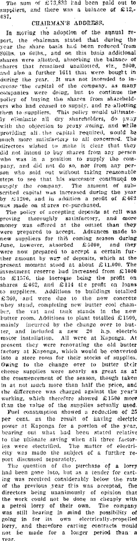 The sum of £73,833 had been paid out to suppliers, and there was a balance of £12,087. CHAIRMAN’S ADDRESS. In moving the adoption of the annual report, the chairman stated that during the year the share basis hi.d been reduced "from 801bs. to 601b5., and on this b.asis additional shares were allotted, absorbing the balance of shares that remained unallotted, viz., 2060, and also a further 1611 that were bought in during the year. It was not intended to Increase 'the capital of the company, as many companies were doing, but. to continue the policy of buying the shares from shareholders who had ceased to supply, and re allotting them to suppliers. This policy would ultimately eliminate all dry shareholders, do pvay with the objection to proxy .voting, and while providing all. the capital required, would be much more satisfactory to ail concerned. The directors wished to make it clear that they did not intend to buy shares from any person who was in a position to supply the company, and did not do so, nor from any person who sold out without taking reasonable steps to see that his successor continued to supply the company. The amount of subscribed capital was increased during the year by £1206, and in addition a profit of £462 was made on stares re-purchased. The policy of accepting deposits at call was proving thoroughly satisfactory, and more money was offered at the outset than they were prepared to accept. Advances made to new suppliers for thils coming season during June, however, absorbed £5OOO, and they were now prepared to accept a certain further amount by way of deposits, which at the present moment stood at about £ 11,000. The investment reserve bad Increased from £lOOO to £1576. the increase being the profit on shares £462, and £ll4 tte profit on loans to suppliers. Additions to buildings totalled £360, and were due to the new concrete whey stand, completing new butter cool chamber, the vat and tank stands in the new butter room. Additions to plant totalled £1509, mainly incurred by rhe change over to butter, and included a new 20 h.p. electrio motor installation. All were at Kaponga. At present they were renovating the old butter factory at Kaponga, which would be converted into a store room for their stocks of supplies. Owing to the change over to butter their cheese supplies were nearly as great as at the commencement of the season, though taken in at not much more than half the price, and ihe difference was charged against the year's working, which therefore showed £l5OO more than the value of the supplies actually used. Fuel consumption showed a reduction of 25 per cent, as the result of having electric power at Kaponga for a portion of the year, bearing out what had been stated relative to the ultimate saving when all three factories were electrified. The matter of eleciriI city was made the subject of a further report discussed separately. The question of the purchase of a lorry had been gone into, but as a tender for carting was received considerably below the rate of the previous year this was accepted, fhe directors being unanimously of opinion that the work could not be done as cheaply with a petrol lorry of their own. The company was still bearing in mind the possibility of going in for its own electrically-propelled lorry, and therefore carting contracts would not be made for a longer period than a year.