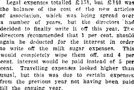 Legal expenses totalled £l5l, but. £l4O was the balance of the cost of the new articles of association, which was being spread orer a number of years, but the directors had decided to finally write it off this year. The directors recommended that 1 per cent, should again be deducted for the interest in order to write off the milk sugar expenses. This would completely wipe them off, and 4 per cent, interest would be paid instead of 5 per cent. Travelling expenses looked higher than usual, but this was due to certain expenses from the previous year not having been paid till the ensuing year.