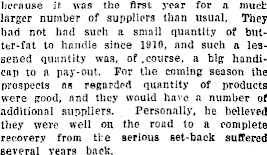because it was the first year for a muck larger number of suppliers than usual. They bad not had such a small quantity of but-ter-fat to handle since 1910, and such n lessened quantity was. of .course, a big handicap to a pay-out. For the coming season the prospects as regarded quantity of products were good, and they would have a number of additional suppliers. Personally, he believed they were well on the road to a complete recovery from tire serious set-back suffered several years back.