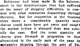 Reference had been made Ih the balancesheet to the disadvantages they had suffered as the result of shipping difficulties, in common with other companies dispatching through Moturoa. But for congestion in the freezing Store there a considerable quantity more cheese could have been got away and caught •he market before it slumped than was actually the case. Had the same quantity of cheese gone forward in proportion to that ; dispatched in the early part of the year by 1 fpmpanies shipping through the port of Pa-