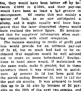 tea, they would have been better off by between £4OOO to £5OOO, and their pay-out would have been at least a %d greater in consequence. Of course this was mainly a matter , of luck, as no one anticipated a plump, and it might equally well have happened that the later dispatched cheese would have realised the better figure. He mentioned this for suppliers’ information when «naking comparison with other companies. The balance standing to credit of profit and loss would provide for an ultimate pay-out of 2s 4d, but so much had had to be estimated that suppliers would be well advised not to count on same befotehand./ Realisations to hand since would, if maintained on the same scale, make it greater, but in these uncertain times it was wisest not to anticipate. At present 2s 3d has been paid for the pcrieb ending December 31/ and Is lid for the past six months. It was proposed to level this up to 2s 3d also by bonuses of 2d payable on the 20th of the next two anOntlis, and