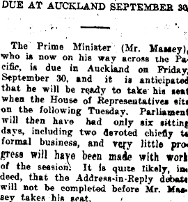 DUE AT AUCKLAND SEPTEMBER 30 The Prime Minister (Mr. Massey), who is now on his way across the Pacific. is due in Auckland on Friday, September 30. and it is anticipated that he will be to take his seat when the House of Representatives siti on the following Tuesday. Parliament will then have had only six sitting days, including two devoted chiefly t< formal business, and vq*y little progress will have been made with worl of the session. It is quite likely, in. deed, that the Address-in-Reply debate will not be completed before Mr. Maa* sey takes his seat.