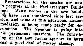 Preparations for the session are novi in progress at the Parliamentary Build-' ings. Many rooms in the new buildhave been completed since last session, and some of this additional aocommodation is being made ready for occupation. The Speaker is going into his permanent quarters. The furnishing of the new rooms appears to cost a good deal of money already.