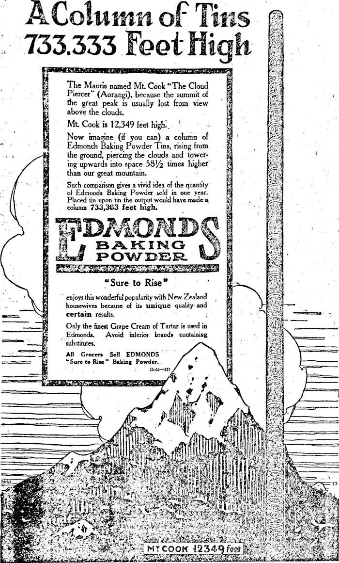 A Column of Tins S 733.333 Feet High J , . The Maoris named Mt. Cook “The Cloud g j !’< Piercer’’ (Aorangi), because the summit of ® | te Ac great peak is usually lost from view ffl 1 E above the clouds. 3 B Mt Cook is 12,349 feet high. ij g Now imagine (if you can) a column of Edmonds Baking Powder Tins, rising from gj 9 the ground, piercing the clouds and tower- H / E * n g upwards into space 58'/2 times higher / ■ than our great mountain. ra | n Fj Such comparison gives a vivid idea of the quantity M : -1 // g of Edmonds Baking Powder sold in one year. BS it id Placed tin upon tin the output would have made a H fcrvT H p column 733,353 feet high. Sy .4 > IpDMONDCI | f ■ I a BAKING ® V g \ POWDER w | X. “Sure to Rise” •Xw E enjoys this wonderful popularity with New Zealand \ \\ housewives because of its unique quality and || J" —— certain results. || -_ Only the finest Grape Cream of Tartar is used in d ... . L- Edmonds. Avoid inferior brands containing w substitutes. L SWa \ "ft All Grocers Sell EDMONDS y/ f A & |||[ ) ll ** Sure to Rise ’* Baking Powder. / * \ h T T—- — 1 ' ' si’|| i ■-==== ■« 3| IU Kfl M&-V‘ RijtMsKOWfcsSii I w »w. ?r • . -. ijMKrg',*. Mt cook 12349 x