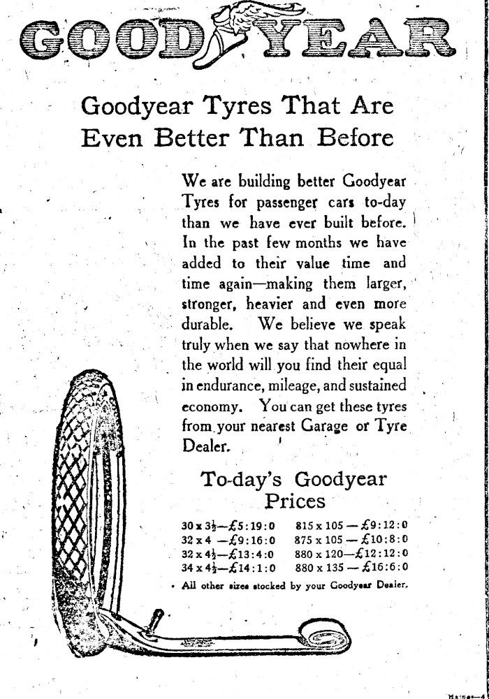 Goodyear Tyres That Are Even Better Than Before We are building better Goodyear Tyres for passenger cars to-day than we have ever built before. In the past few months we have added to their value time and time again—making them larger, stronger, heavier and even more durable. We believe we speak truly when we say that nowhere in tthe world will you find their equal in endurance, mileage, and sustained economy. You can get these tyres from your nearest Garage or Tyre Dealer. To-day’s Goodyear Prices 30x3j—£5:19:0 815 x 105 £9:12 :0 32x4—£9:16:0 875 x 105 £10:8:0 32 X4i—£l3 :4 :0 880 x 120—£12:12 :0 34x4j—£14:1:0 880 x 135 £16:6:0 , j Ail other size* stocked by your Goodyear Dealer, a, | H 41