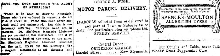 pAVE YOU EVER SUFFERED THE AGONY GEORGE A. PLGH. OF NEURALGIA? MOTOR PARCEL DELIVERY. for III * iSf || wherever motors go. Made of purest |||l| is no need to describe Neuralgia. J?'ll rubber. to have endured its torments do not ilj SPENCER'MOULTON 11 111 •ee.ll It. Those who have never sur- -p 4ECELS collected from or delivered to |!i j ALL-BRITISH TYRES II ad not understand. But this is un- of Town or Su burbe twice ■ aaaaatWFr? '//. suffering. Neuralgia need not be j For narticulars ring up’phone 139. 'AWT Y 111 De. gbeldon-s Magnetic Liniment datly. for particum.rs™g p m end io this martyrdom. Rub it on bPEEVX ead, back of the neck, on the gums { . • - ton's Ifacnetic Linimenr. smoothes p . , DeDOt’ W the pain, draws out the Neuralgia like j F ' For Co ugh 9 and Colds, never _ Woods’ Great Peppermint Cur.