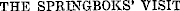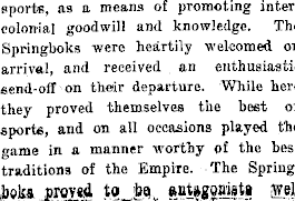 sports, as a means of promoting intercolonial goodwill and knowledge. The Springboks were heartily welcomed on arrival, and received an enthusiastic send-off on their departure. While here they proved themselves the best of sports, and on all occasions played the game in a manner worthy of the best traditions of the Empire. The Spring,boks proved (Well