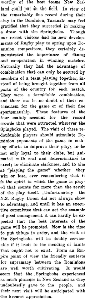 worthy of the beet teame New Zealaud could put -in the field. Id view of the remarkably fine record during their stay in the Dominion, Taranaki may feel gratified that they succeeded in making a draw with the Springboks. Though our recent visitors had no new developments of Rugby play to spring upon Dominion competitors, they certainly demonstrated the importance of fitness and co-operation in winning matches. Naturally they had the advantage of combination that can only be secured by members of a team playing together, instead of being brought together from all parts of the country for each match. They were a formidable combination, and there can be no doubt of their enthusiasm for the game or of their fine sportsmanship. These features of the tour mainly account for the record crowds that were attracted wherever the Spingboks played. The visit of these redoubtable players should stimulate Dominion exponents of the game to making efforts to improve their play; to be not only loyal to their clubs, but animated with zeal and determination to excel; to eliminate slacknes&s, and to aim at “playing the game” whether they win or lose, ever remembering that it is the spirit in which the game is played that counts for more than the result of the play itself. Unfortunately the N.Z. Rugby Union did not always show to advantage, and until it has an executive committee that can set the example of good management it can hardly be expected that the be§t interests of the game will be promoted. Now is the time to put things in order, and the visit of the Springboks will be doubly serviceable if it leads to the mending of faults that ought not to exist. From, an Empire point of view the friendly contests for supremacy between the Dominions are well worth cultivating. It would seem that the Springboks experienced as much pleasure in New Zealand as they undoubtedly gave to the people, and their next visit will be anticipated with the keenest appreciation.