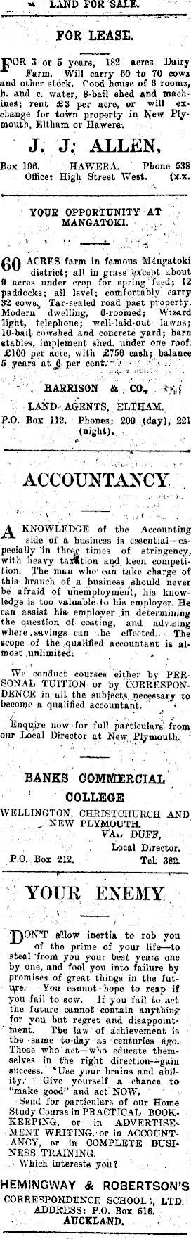 LAND FOR SALE. FOR LEASE. p'OR 3 or 5 years, 182 acres Dairy Farm. Will carry 60 to 70 cows and other stock, food house of 6 rooms, h. and c. water, 8-bail shed and machines; rent £3 per acre, or will exchange for town property in New Plymouth, Eltham or Haw era. J. J. ALLEN, Box 196. HAWERA. Phone 538 Office: High Street West. (x.x. YOUR OPPORTUNITY AT MANGATOKI. ACRES farm in famous Mangatoki district; all in grass except 9 acres under crop for spring feed; 12 paddocks; all level; comfortably carry 32 cows. Tar-sealed road paet property. Modern dwelling, 6-rooined; Wizard light, telephone; well-laid-out lawns; 10-bail cowshed and concrete yard; barn stables, implement shed, under one roof. £lOO per acre, with £750 cash; balance 5 years at 6 per cent. HARRISON & CO., rri.i LAND AGENTS, ELTHAM. P.O. Box 112. Phones: 200 (day), 221 (night). ACCOUNTANCY A. KNOWLEDGE of the Accounting side of a business is. essential—especially 'in these times of stringency, with heavy taiMtion and keen competition. The man who can take charge of this branch of a business should never be afraid of unemployment, his knowledge is too valuable to his employer. He can assist his employer in determining the question of costing, and advising where .savings can be effected. The scope of the qualified accountant is almost unlimited; We conduct courses either by PERSONAL TUITION or by CORRESPONDENCE in all. the subjects necessary to become a qualified accountant. Enquire now for full particulars from our Local Director at New Plymouth. BANKS COMMERCIAL COLLEGE WELLINGTON, CHRISTCHURCH AND NEW PLYMOUTH. DUFF, Local Director. P.O. Box 212. TeL 382. YOUR ENEMY JJON’T fillow inertia to rob you of the prime of your life—to steal from you your best years one by one, and fool you into failure by promises of great things in the future. You cannot hope to reap if you fail to sow. If you fail to act the future cannot contain anything for you but regret and disappointment. The law of achievement is the same to-day as centuries ago. Those who act —who educate themselves in the right direction—gain success. “Use your brains and ability.’ Give yourself a chance to “make good” and act NOW, Send for particulars of our Home Study Course in PRACTICAL BOOKKEEPING. or in ADVERTISEMENT WRITING, or in ACCOUNTANCY, or in COMPLETE BUSINESS TRAINING. Which interests you? HEMINGWAY & ROBERTSON’S CORRESPONDENCE SCHOOL!, LTD ADDRESS: P.O. Box 516. AUCKLAND.