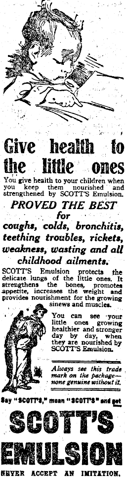 Give heaMh to the little ones You give health to your children when you keep them nourished and strengthened by SCOTT’S Emulsion. PROVED THE BEST for coughs, colds, bronchitis, teething troubles, rickets, Weakness, Wasting and all childhood ailments. SCOTT’S Emulsion protects the delicate lungs of the little ones. It strengthens the bones, promotes appetite, increases the weight and provides nourishment for the growing f sinews and muscles. You can see your little ones growing healthier and stronger day by day, when they are nourished by SCOTT’S Emulsion. Always see this trade mark on the package—none genuine without it. Say “SCOTT’S* mean “SCOTTSfit SCOTT’S EMULSION HEYER ACCEPT AN IMITATION.