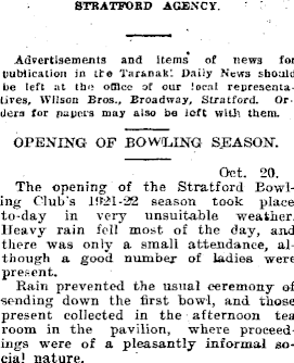 STRATFORD AGENCY. Advertisements and items of news for publication in tte Taranaki Daily should be left at the office of our local representatives, Wilson Bros., Broadway, Stratford. Orders for papers may also be left with them. OPENING OF BOWLING SEASON. Oct. 20. The opening of the Stratford Bowling Club's 1921-22 season took place to-day in very unsuitable weather. Heavy rain fell most of the day, and there was only a small attendance, although a good number of ladies were present. Rain prevented the usual ceremony of sending down the first bowl, and those present collected in the afternoon tea room in the pavilion, where proceedings were of a pleasantly informal social nature.