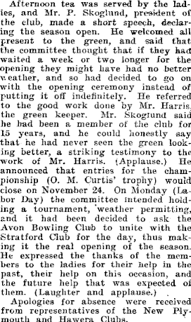 Afternoon tea was served by the ladies, and Mr. P. Skoglund, president of the club, made a short speech, declaring the season open. He welcomed all present to the green, and said that” the committee thought that if they had waited a week or two longer for the opening they might have had no better v. eather, and so had decided to go on with the opening ceremony instead of putting it off indefinitely. He referred to the good work done by Mr. Harris, the green keeper. Mr. Skoglund said he had been a member of the club for 15 years, and he could honestly say that he had never seen the green looking better, a striking testimony to the work of Mr. Harris. • Applause.) He announced that entries for the championship (0. M. Curtis’ trophy) would close on November 24. On Monday (Labor Day) the committee intended holding a tournament, weather permitting, and it had been decided to ask the Avon Bowling Club to unite with the •Stratford Club for the day, thus making it the real opening of the season. He expressed the thanks of the members to the ladies for their lielp in the past, their help on this occasion, and the future help that was expected of them. (Laughter and applause.) Apologies for absence were received from representatives of the New Plymouth and Hawera Clubs.