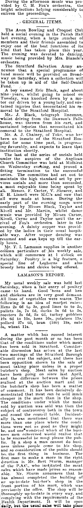 During the afternoon music was provided by C. H. Fox's orchestra, the bright selections helping considerably to enliven the proceedings. GENERAL ITEMS. The Avon Bowling and Croquet Club held a social evening in the Parish Hall last evening, when a large number of members and their friends assembled to enjoy one of the best functions of its kind that has taken place this year. The evening was devoted to dancing, music being provided by r Mrs. Bianchi's orchestra. The Stratford Salvation Army announce that a special programme of band music will be provided on Broadway on Saturday, when a collection will be taken up in aid of the Self-Denial Fund. A boy named Eric Black, aged about nine • years, whilst going to school on Tuesday, was knocked down by a motor car driven by a young lady, and sustained injuries that necessitated his removal to'the Stratford Hospital. Mr. J. Black, telegraph linesman., whilst driving from the Dawson’s Falls house, was thrown from his cart, and sustained injuries that necessitated his removal to the Stratford Hospital. Mr. A. J. Chainey, of Toko, wno ha c been an inmate of the Stratford Hos- ■ pital for some time past, is progressing favorably, and expects to leave that institution shortly. The last of the series of socials held under the auspices of the Anglican Church Committee was held at Midhirst on Wednesday evening, and proved a fitting termination to the successful series. The committee had set out to maintain the high standard set by previous socials and more than succeeded, a most enjoyable time being spent by ali. Messrs. F. Carter, V. Shearer, and E H. Linnell were M.C.’s and saw that -all were made at home. During the early part of the evening songs were rendered by Misses Black, Taylor and Ki veil and Mr. Martin, whilst dance music was provided by Misses Carter, Kivell, Coyne and Taylor until the arrival of FoVs orchestra later in the evening. A dainty supper was provided by the ladies in their usual hospitable way. After supper dancing was resumed and was kept up till the early hours. Mr. T. I. Lamason supplies in .another column particulars of his weekly sale, which will commence at 1 o'clock on Saturday. Poultry, is a big feature, a special line of Leghorns and also broody hens and chicks being offered. LAMASON’S REPORT. My usual weekly sale was held last Saturday, when a fair entry of poultry came to hand. Good hens and hen and chickens are in very good demand. All lines of vegetables were scarce. The following is an idea of market rates: Hens 2s 6d to 3s, good lines 4s to ss, pullets ss, 7s 6d, ducks 3s 6d to ss, ropsters 2s 6d, 3s 6d, turkey gobblers I 12s 6d to 15s, hens 10s,. potatoes 13s/ pollard 27s nd, bran (180) ISs, oats ss, wheat Ils. A matter which has roused interest during the past month or so has been that of the conditions under which meat has been sold in Stratford. Considerable discussion has arisen at the last two meetings of the Stratford Borough Council over the subject, and there has I been opposition shown to the sale of rmeat taking place unless in a proper butcher’s shop. Meat sales by auction have been going on since last April, and the difference between the prices realised at the auction mart and in the butcher’s shop has been a matter of comment. It has been decisively demonstrated that meat can be sold much cheaper in the mart than in the shop. The conditions under which the meat sold by auction was sold was then the subject of controversy both in the town and round the council table. Incidentally it. was mentioned that there was (more than one place, where the condij tions were riot as good as they might ■be. and one*wondered which of the business men concerned would realise that to be successful lie inns/ please the public. In a shop a man cannot do busij ness unless people come to his shop, .and so consideration of the public should be. the first thing in business. The first man to make a move in the right direction is Mr. Bert Sturm, manager of the P.A.C., who instituted the meat [sales which have made prices so reasonable. Mr. Sturm announces that he has almost completed the building of an up-to-date butcher’s shop in the front portion of his mart, which was previously the office. The shop will be thoroughly up-to-date in every way, and complying with the requirements of the .Health Department. It will be open | daily, but the usual sales will take place j