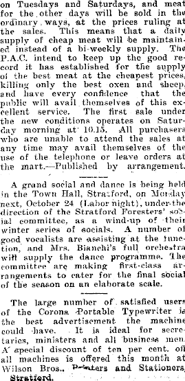 on Tuesdays and Saturdays, and meat for the other days will be sold in the ordinary ways, at the prices ruling at the sales. This means that a daily supply of cheap meat will be maintained instead of a bi-weekly supply. The P.A.C. intend to keep up the good record it has established for the supply ol the best meat at the cheapest prices, killing only the best oxen and sheep, -and have every confidence that the public will avail themselves of this excellent service. The first sale under the new conditions operates on Saturday morning at 10.15. All purchasers who are unable to attend the sales at any time may avail themselves of the use of the telephone or leave orders at the mart.—Published by arrangement. A grand social and dance is being held hi the Town Hall, Stratford, on Monday next, October 24 (Labor night), under-the direction of the Stratford Foresters’ social committee, as a wind-up of their winter series of socials. A number of good vocalists are assisting at the function, and Mrs. Bianchi’s full orchestra will supply the dance programme. Hie committee are making first-class arrangements to eater for the final social of the season on an elaborate scale. The large number of satisfied users of the Corona Portable Typewriter is the best advertisement the machine could have. It is ideal for secretaries, ministers and all business men. A' special discount of ten per cent, off all machines is offered this month at . Wilson Bros.. and Stationers, I Stratford.