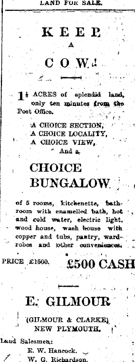 LAND FOR SALS. KEEP. ‘ A C O WJ ACRES of splendid landonly ten minutes from the Post Office. •A CHOICE SECTION, A CHOICE LOCALITY, A CHOICE VIEW, And a CHOICE BUNGALOW of 5 rooms, kitchenette, bathroom with enamelled bath, hot and cold water, electric light, wood house, wash house with copper and tubs, pantry, wardrobes and Other conveniences. PRICE £l5OO. £ 5OO CASH E. GILMOUR (GILMOUR & CLARKE) NEW PLYMOUTH. Land Salesmen: E. W. Hancock. W. G. Richardson.