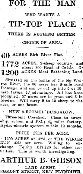 FOR THE MAN WHO WANTS A TIP-TOP PLACE THERE IS NOTHING BETTER CHOICE OF AREA. ACRES Rich River Fiet. 1 2-sheep country, and about 300 Heed of Cattle. Or 1200 ACRES Ideal Fattening Land. Situated on the banks of the big Wairoa River, the 60 acres has f-mile road frontage, and can be cut up into 5 or 10 acre farms, to advantage. All has been ploughed; 57 acres are in grass and 3 in lucerne. Will carry 8 to 10 sheep to the acre, or one beast. NEW 8-ROOMEL BUNGALOW. Three-bail Cowshed. Close to township, school and P. 0.; 4A miles factory. Hydro-electric syatem within 12 months. PRICE £ll5 PER ACRE. 1200 ACRES at £25, or THE WHOLE RUN £23 per acre. Willing to exchange. Equity £17,720 for other securities. This is worth investigating. ARTHUR B. GIBSON LAND AGENT. F.GMONT STREET, NEW PLYMOUTH,