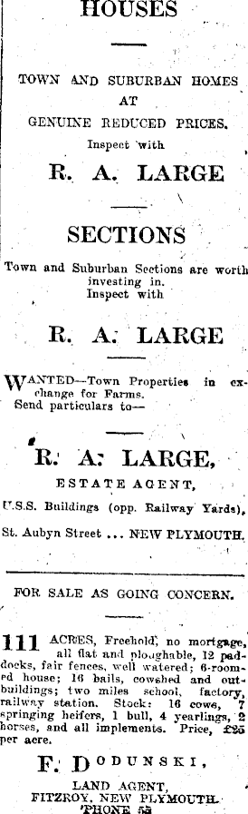 HOUSES TOWN AND SUBURBAN HOMES AT GENUINE REDUCED PRICES. Inspect with R. A, LARGE SECTIONS Town and Suburban Sections are worth investing in. Inspect with R. A. LARGE yi/ANTED —Town Properties in exchange for Farms. Send particulars to—*R. A; LARGE, ESTATE AGENT, t’.S.S. Buildings (opp. Railway Yards), St. Aubyn Street ... NEW PLY’MOUTH. FOR SALE AS GOING CONCERN. 11l ACRES, Freehold, no mortgage, all flat and nloughable, 12 paddocks, fair fences, well watered; 6-room-ed house; 16 bails, cowshed and outbuildings; two miles school, factory, railway station. Stock: 16 cows, 7 springing heifers, 1 bull, 4 yearlings, 2 horses, and all implements. Price, £25 per acre. F. D 0 D V N 8 K i» LAND AGENT. FITZROY, NEW PLYMOUTHTHONE 53