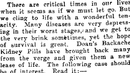 There are critical times in our lives when it seems as if we must let go. But we cling to life with a wonderful tenacity. Many diseases are very depressing in their worst stages,/ and we get to the very brink sometimes, yet the hope of survival is grea-t. Doan’s Backache Kidney Pills have brought back many from the verge and given them a new lease of life. The following case should be of interest. Read it: —
