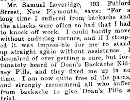 Mr. Samuel Loveridge, 193 Fulford Street, New Plymouth, says: “For a long time I suffered fron; backache and the attacks were often so bad that I had to knock off work. I could hardly move without enduring torture, and if I stooped it was impossible for me to stand up straight again without assistance. I despaired of ever getting a cure, but fortunately heard of Doan’s Backache Kidney Pills, and they fixed me up in no time. I am now quite free of the pains, and strongly recommend all who suffer from backache to give Doan’s Pills a trial.