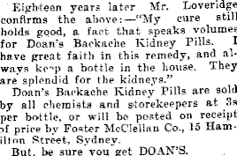 Eighteen years later Mr. Loveridge confirms the above: —“My cure still holds good, a fact that speaks volumes for Doan’s Backache Kidney Pills. I have great faith in this remedy, and always ke n p a bottle in the house. They are splendid for the kidneys.” Doan’s Backache Kidney Pills are sold by all chemists and storekeepers at 3s per battle, or will bo posted on receipt of price by Foster McClellan Co., 15 Hamilton Street, Sydney. But, be sure you get DOAN’S.