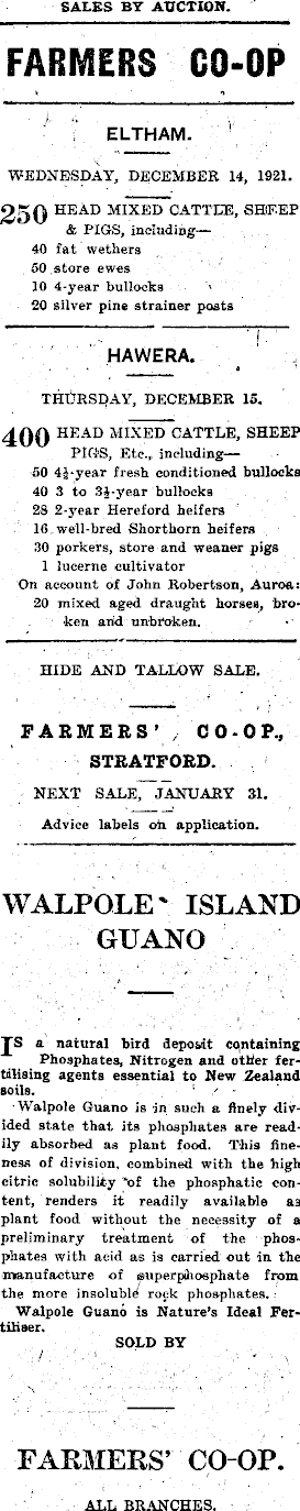 SALES BY AUCTION. FARMERS CO-OP ELTHAM. WEDNESDAY, DECEMBER 14, 1921. 250 HEAD MIXED CATTLE, SHEEP & PIGS, including—--40 fat wethers 50 store ewes 10 4-year bullocks 20 silver pine strainer posts HAWERA. THURSDAY, DECEMBER 15. 400 HEAD MIXED CATTLE, SHEEP PIGS, Etc.,, including — 50 4J-year fresh conditioned bullocks 40 3 to 3|-year bullocks 28 2-year Hereford heifers 16 well-bred Shorthorn heifers 30 porkers, store and weaner pigs 1 lucerne cultivator On account of John Robertson, Auroa: 20 mixed aged draught horses, broken and unbroken. HIDE AND TALLOW SALE. FARMERS’ CO-OP., STRATFORD. NEXT SALE, JANUARY 31. Advice labels on application. WALPOLE' ISLAND GUANO JS a natural bird deposit containing Phosphates, Nitrogen and other fertilising agents essential to New Zealand soils. •Walpole Guano is in such a finely divided state that its phosphates are readily absorbed as plant food. This fineness of division, combined with the high citric solubility of the phosphatic content, renders it- readily available as plant food without the necessity of a preliminary treatment of the phosphates with acid as is carried out in the manufacture of superpiho-sphate from the more insoluble rock phosphates. Walpole Guano is Nature’s Ideal Fertiliser. SOLD BY FARMERS’ CO OP. ALL BRANCHES.